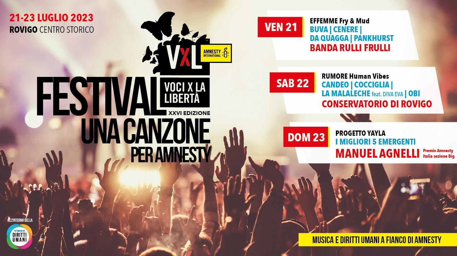 La premiazione di Manuel Agnelli avverrà nell’ambito della 26ª edizione del festival Voci per la Libertà – Una canzone per Amnesty che si terrà per la prima volta a Rovigo dal 21 al 23 luglio 2023 e che assieme a tante altre iniziative, a partire da lunedì 17 luglio, andrà a costruire la Settimana dei diritti umani, una grande manifestazione multidisciplinare per promuovere i diritti umani attraverso l’arte e la cultura, con un ricco calendario di appuntamenti, sia pomeridiani che serali, ad ingresso gratuito.