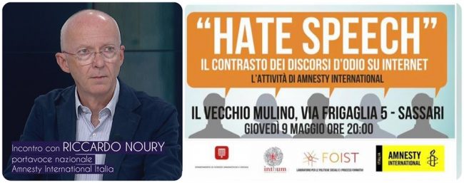 Giovedì 9 Maggio alle 20 al Vecchio Mulino, Amnesty International Sassari organizza un dibattito con Riccardo Noury, portavoce nazionale di Amnesty International – Italia per parlare di hate speech e contrasto dei discorsi d’odio su internet