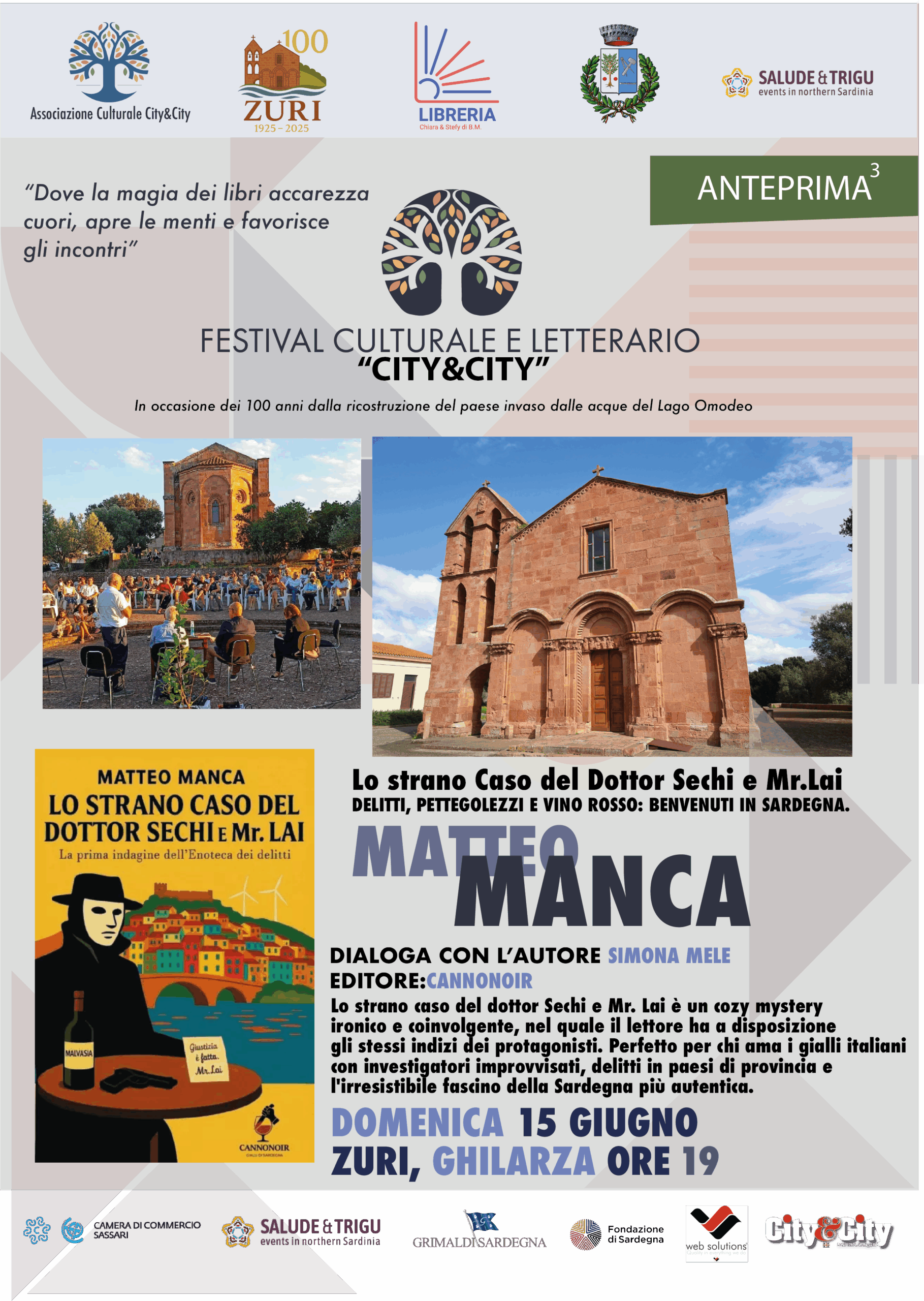 Il 15 giugno, nella suggestiva cornice di Zuri, nella cornice della Chiesa di San Pietro, terza anteprima letteraria del Festival City&City, un evento dedicato alla letteratura e alla cultura urbana. Protagonista il romanzo “Lo strano caso del Dottor Sechi e Mr. Lai”, scritto da Matteo Manca, sindaco di Norbello e autore di gialli ironici ambientati in Sardegna.