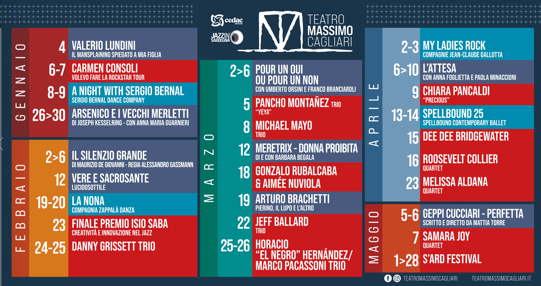 “Questa – ha commentato l’Assessora alla Cultura del Comune di Cagliari Maria Dolores Picciau – è una giornata storica. L’unione tra CeDAC e Jazz in Sardegna, due grandi pilastri nell’ambito dello spettacolo e dell’organizzazione ad altissimi livelli, riporta Cagliari a qualche decennio fa, quando era il centro della cultura nazionale e internazionale grazie agli straordinari palinsesti. E quel momento sembra ora essere tornato. Prosa, danza, circo, musica jazz con grandi firme, ma voglio sottolineare che si da grandissimo spazio anche ai giovani. Il Teatro Massimo si propone come una spazio dove non si faranno solo gli spettacoli ma diventerà una vetrina della città oltre che un centro per fare rete con le attività produttive e commerciali di Cagliari”.