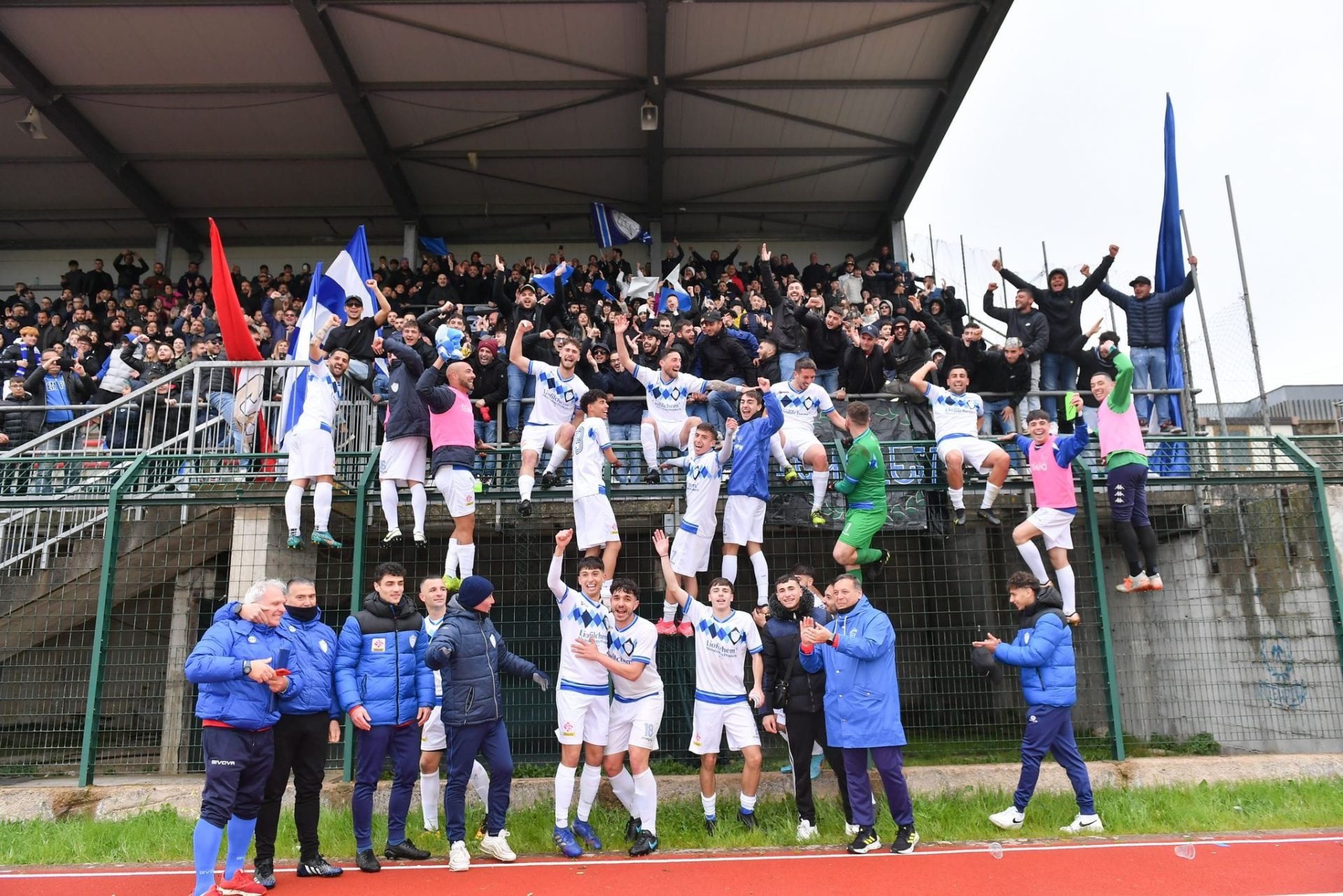 Nella foto i festeggiamenti dei giocatori e tifosi del Tempio a fine gara
