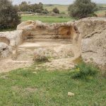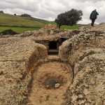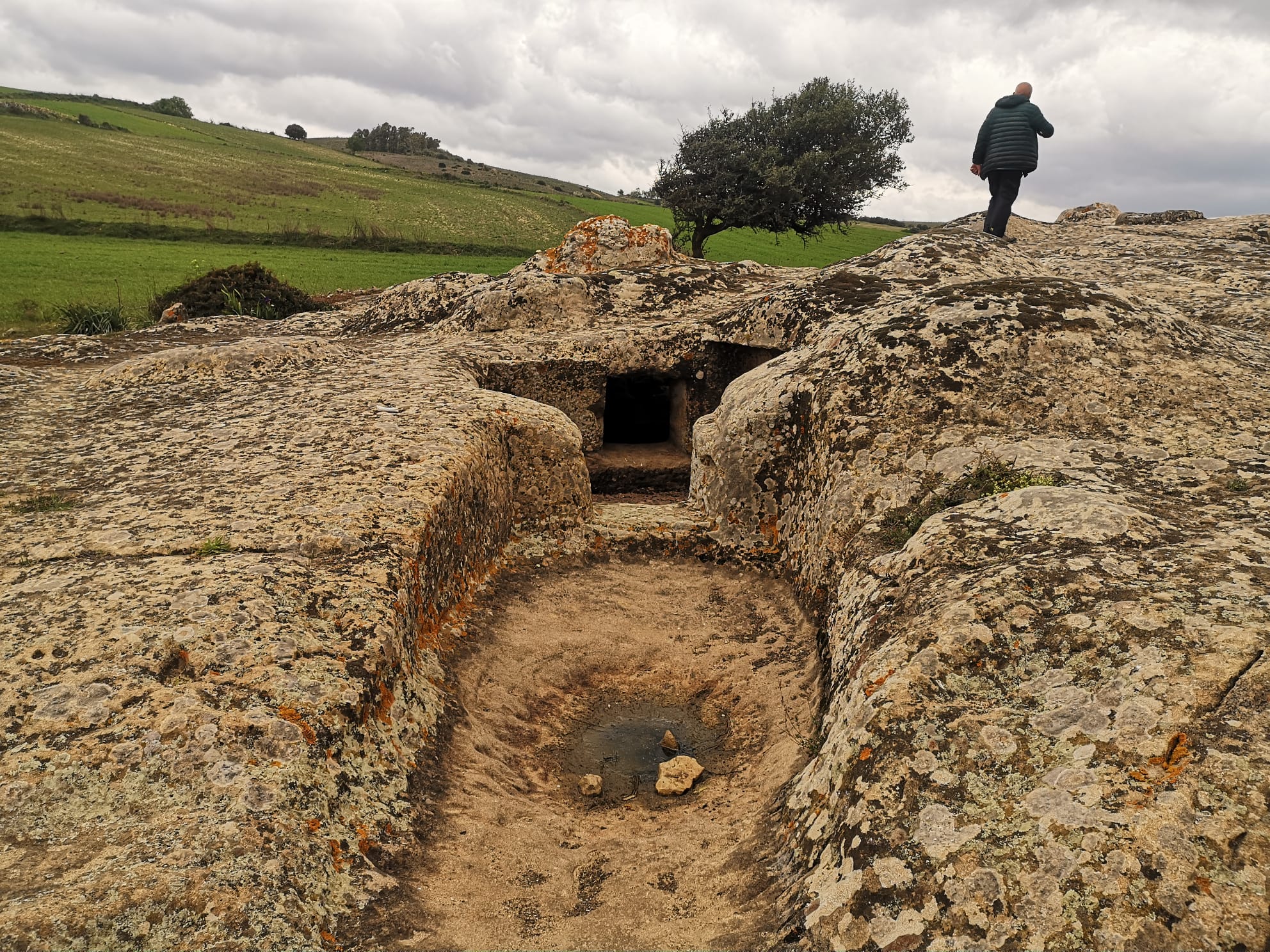 Le domus 5, 6, 7 sono del tipo a pozzetto con anticella e cella. La cella della tomba 6 presenta una nicchia rettangolare decorata con ocra rossa, un bancone sepolcrale ed un pilastro. Altre coppelle sono incise nella roccia sovrastante il secondo gruppo di tombe. La necropoli viene datata al Neolitico finale (cultura di San Michele, 3200-2800 a.C.), ma non mancano attestazioni di un riuso durante il Bronzo antico (cultura di Bonnanaro, 1800-1600 a.C.). La necropoli di Corongiu – risale al Neolitico finale – è costituita da un pozzetto d’accesso, un’anticella e una cella. Sulla parete d’accesso si mostra – interessantissimo – un ornato simbolico inciso e sottolineato in rosso. La fascia superiore è decorata al centro da un elemento verticale che si apre superiormente in due spirali: il naso e gli occhi della dea madre, sostengono gli archeologi. Ai lati in basso una linea a zigzag è limitata a destra da una spirale e a sinistra da due doppi cerchi. In alto, ai lati della doppia spirale od occhi della dea, sono rappresentati due motivi “a barca” con terminazioni a spirale. Due lunghi elementi verticali che si aprono superiormente e inferiormente in due spirali decorano le pareti ai lati del portello. Guardando queste incisioni non si può non avere un tuffo al cuore, perché queste testimonianze risalgono a 5 mila anni fa.