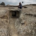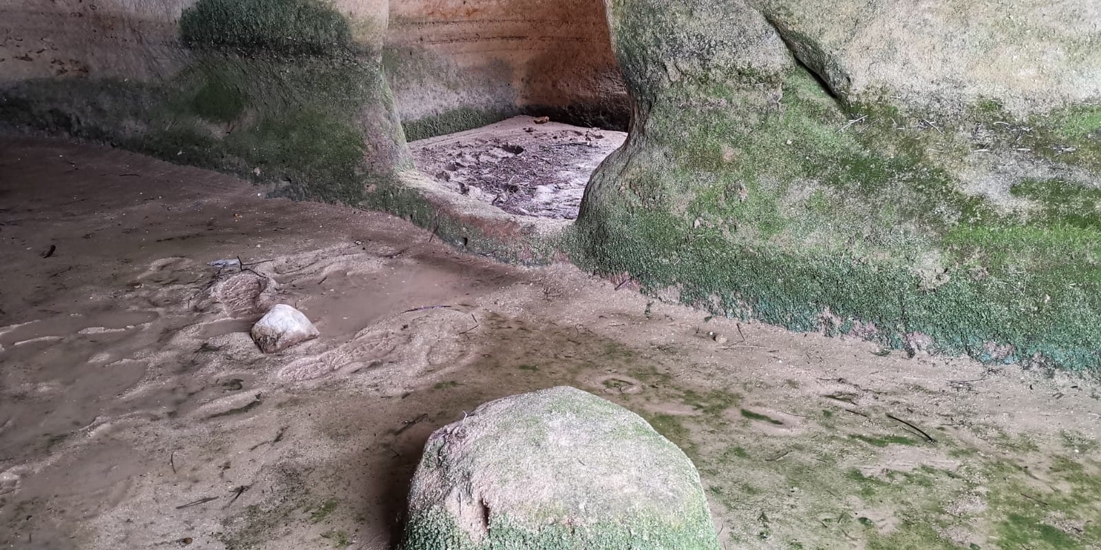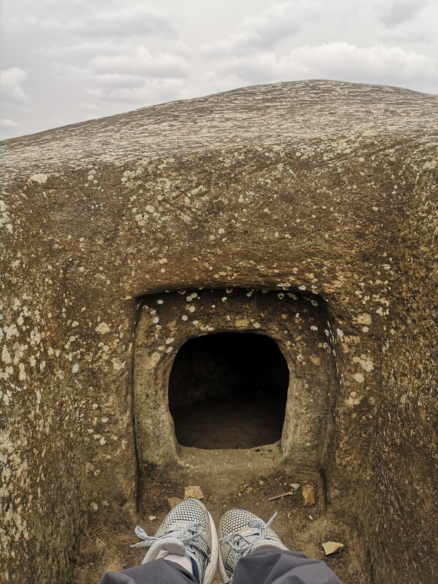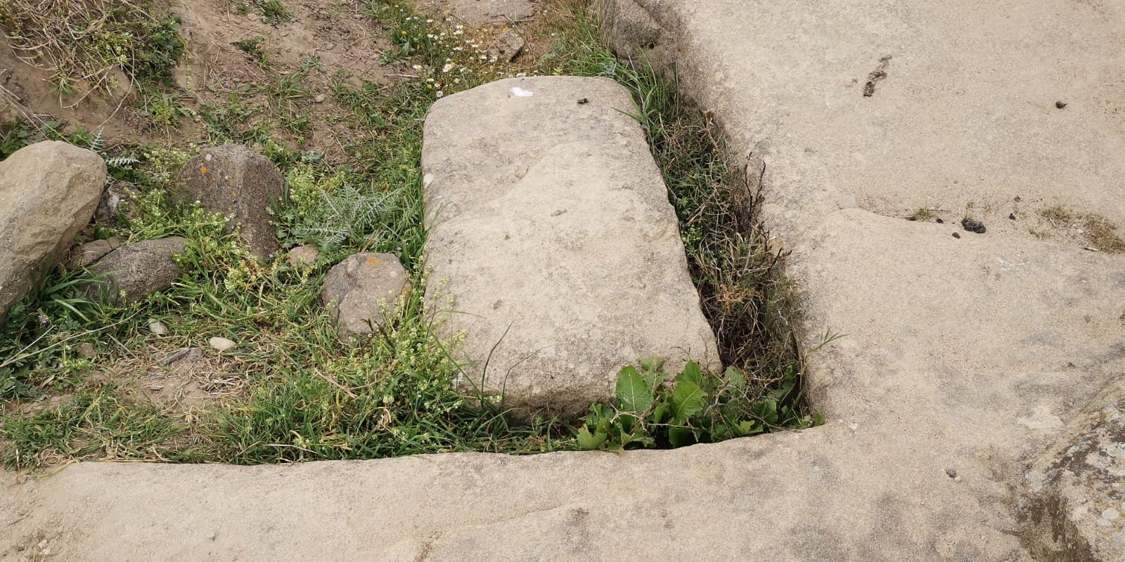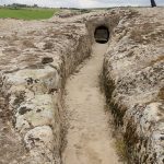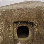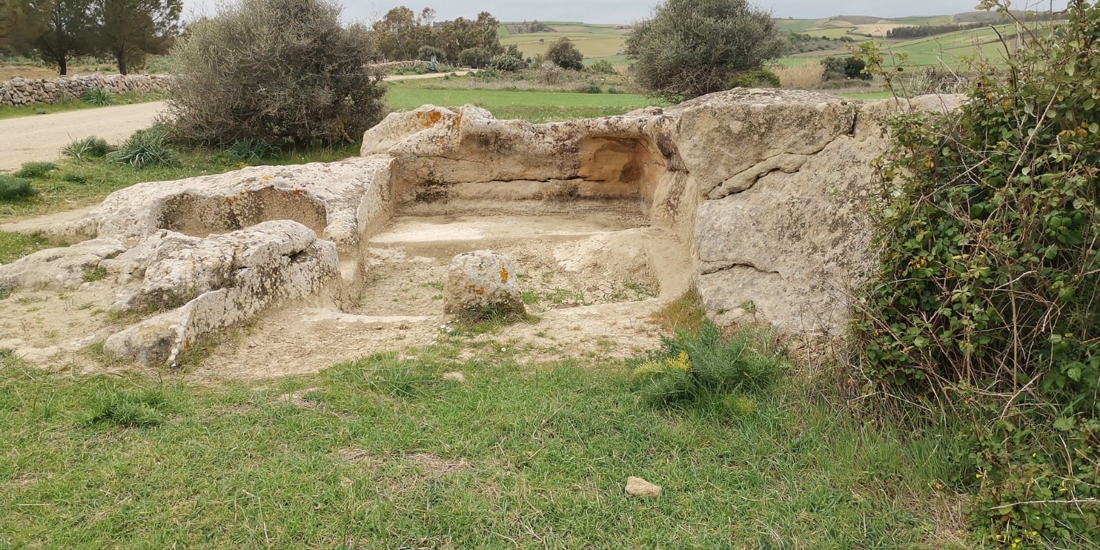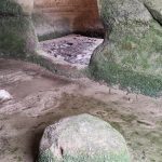 La parete che si oppone alla piccola porta è decorato in ocra rossa: due protomi taurine con schema a T dentro un riquadro rettangolare. Il colore rosso e la protome taurina sono i segni più comuni della religiosità neolitica sarda. “La tomba 4 – ci aiutiamo con la relazione di sardegnacultura.it – è articolata in un corridoio d’accesso, un’anticella e una cella. L’ingresso è orientato ad Est. La cella riproduce lo schema della capanna: lo dimostrano i particolari delle pareti e del soffitto dove corrono larghe fasce in rilievo simulanti il tetto e il relativo impianto ligneo di sostegno. Prossima al primo gruppo di tombe è un’area sacra con focolare e coppelle probabilmente destinata ai rituali funebri che precedevano la tumulazione“.