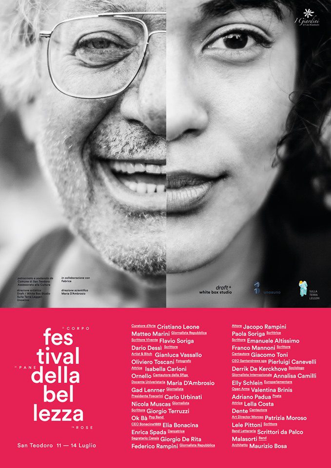 Il Festival della Bellezza è un progetto di Gianluca Vassallo per Associazione Culturale Draft e White Box Studio, relalizzato con il sostegno del Comune di San Teodoro, Assessorato alla Cultura, con la co-produzione e condivisione della direzione artistica del festival letterario Sulla Terra Leggeri. La consulenza scientifica è di Maria D’Ambrosio, il sostegno comunicativo e la collaborazione organizzativa di FABRICA.