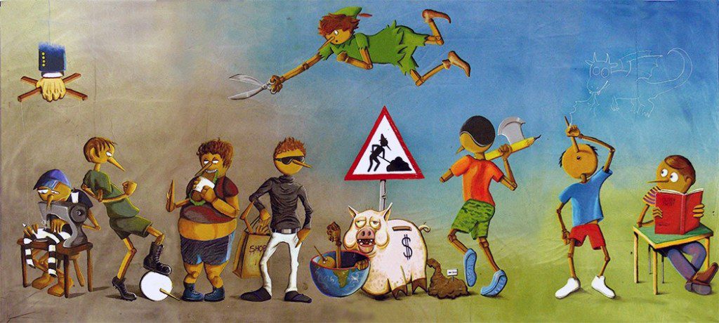 Ispirati dalla favola di Pinocchio, studenti italiani hanno espresso la complessa realtà del lavoro minorile allo scopo di promuovere la consapevolezza in un linguaggio accessibile a tutti, anche ai bambini. La tela si intitola “C’era una volta… Grillo Parlante, dove sei?” e sarà esposta a Palazzo di Città fino al 13 maggio.