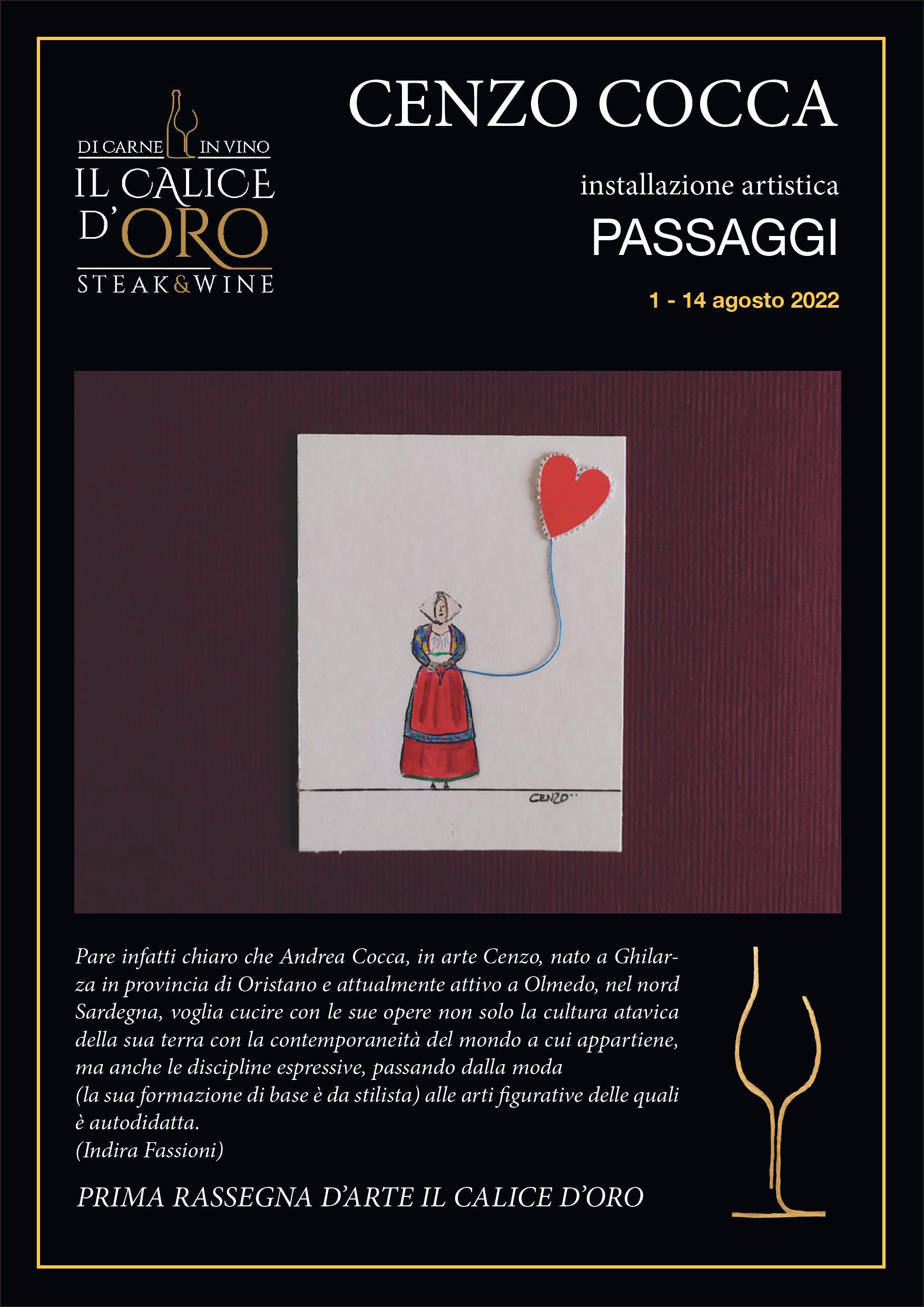 Il primo agosto, ore 20.30, appuntamento presso il ristoranteIl Calice d’Orocon la presentazione dell’installazione artistica di Cenzo Cocca, Passaggi, sospesa tra moda e arti figurative, tradizione e modernità.