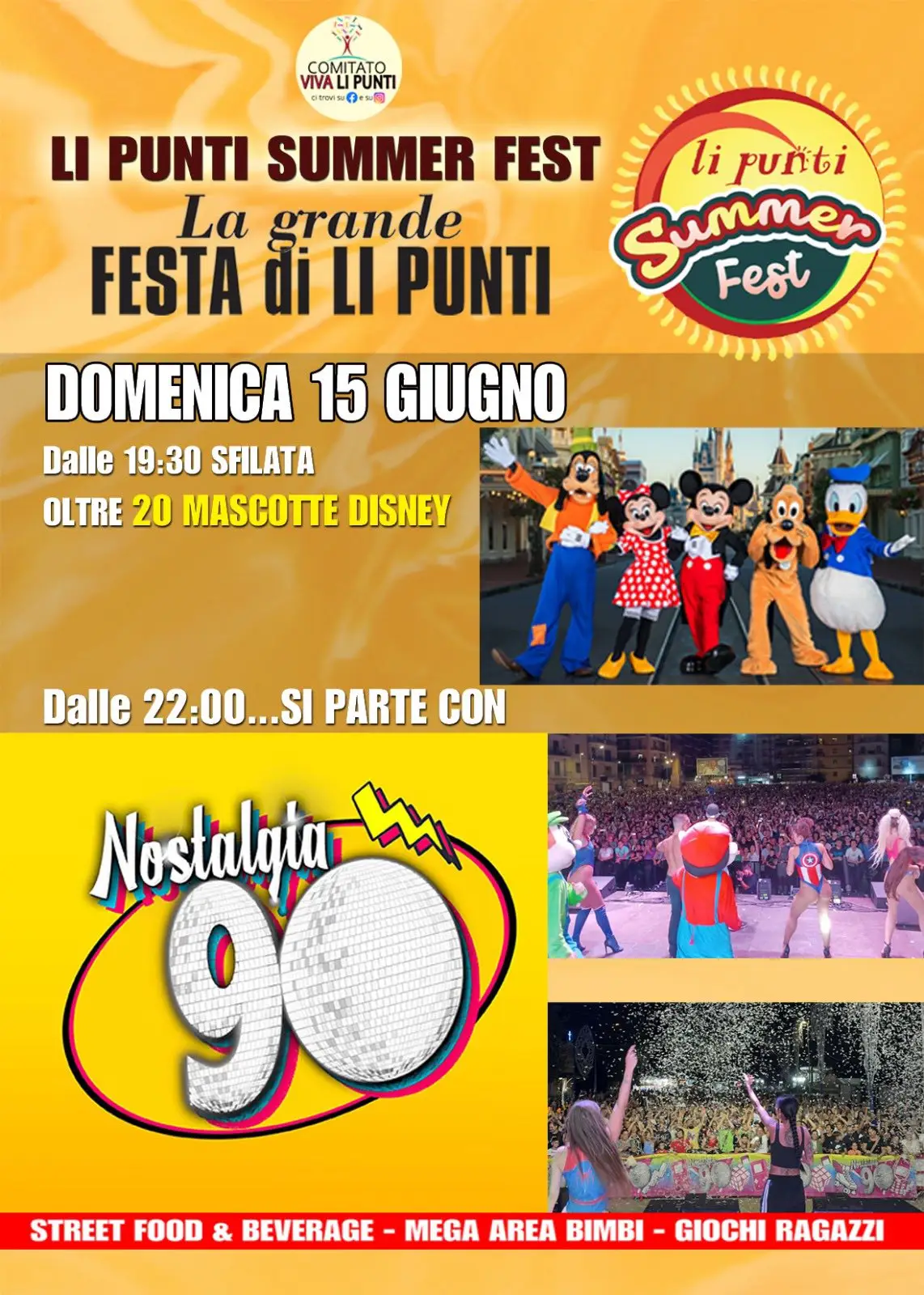 • Concerti live con artisti nazionali e locali, tra cui il grande show italiano dedicato agli anni ‘90.