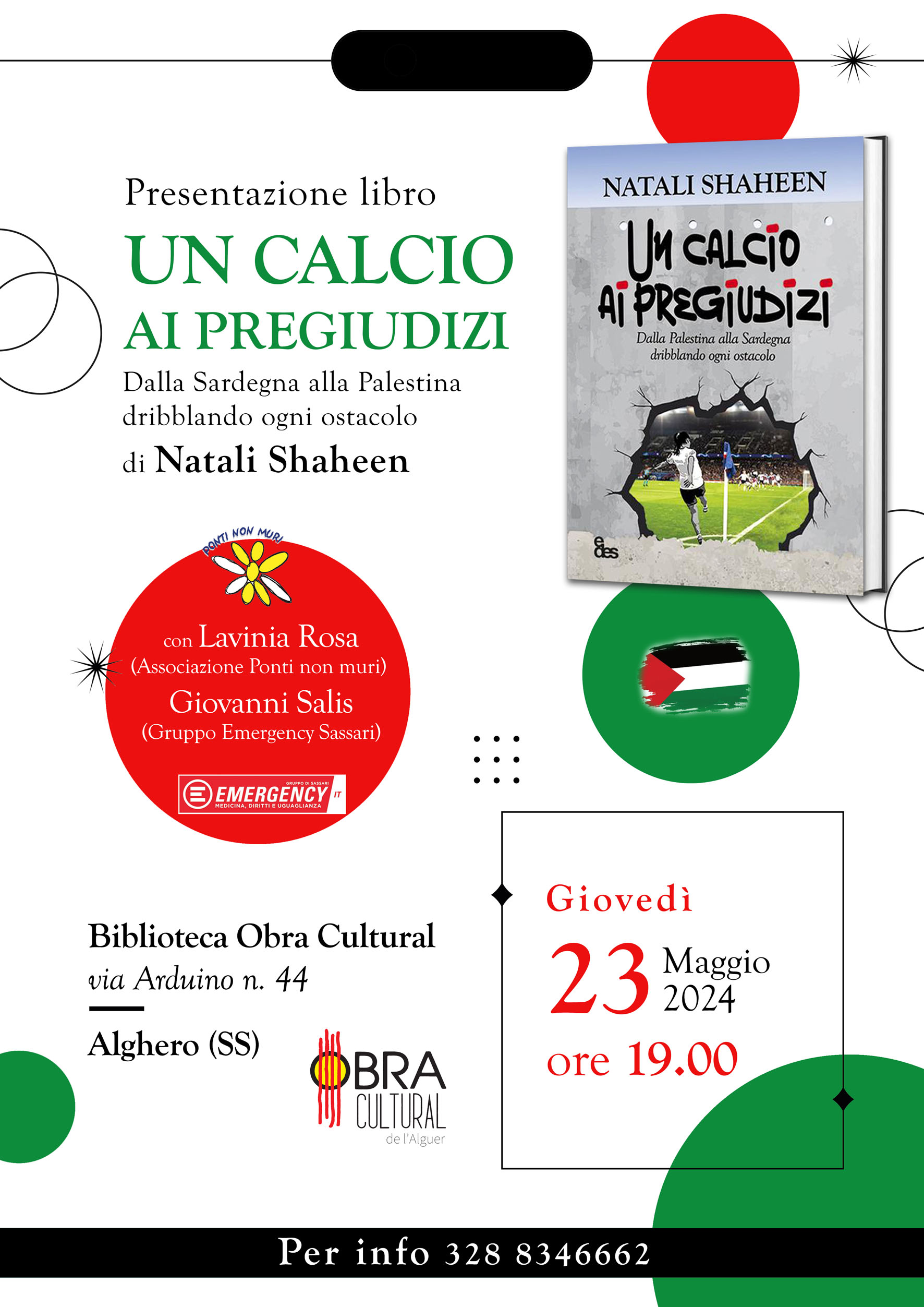 Giovedì 23 Maggio, alle ore 19.00, la biblioteca catalana Obra Cultural di Alghero (via Arduino n.44), ospiterà la calciatrice e allenatrice palestinese Natali Shaheen (Premio Internazionale Sport e Diritti Umani Amnesty Italia e Sport4Society 2023) per presentare, insieme a Lavinia Rosa dell’associazione Ponti non Muri e a Giovanni Salis del gruppo Emergency Sassari, il suo libro “Un calcio ai pregiudizi. Dalla Sardegna alla Palestina dribblando ogni ostacolo” dove racconta e testimonia la sua storia di vita e di amore per lo sport, oltre i confini e i pregiudizi e al di là delle guerre e delle religioni.