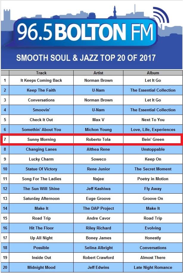 Con la conclusione dell’anno, si stilano le classifiche dei migliori brani ed artisti del 2017: l’artista scala le classifiche internazionali e porta a casa il settimo posto della classifica TOP 20 del 2017 della prestigiosa stazione radiofonica BOLTON FM, posizionandosi in mezzo a grandi del genere, come Norman Brown, Boney James e Najee.