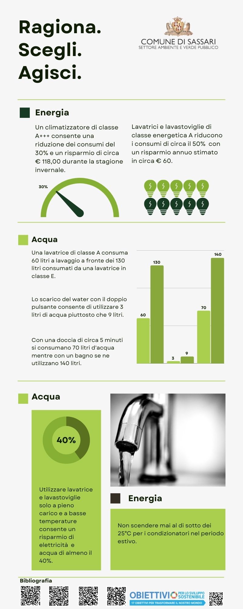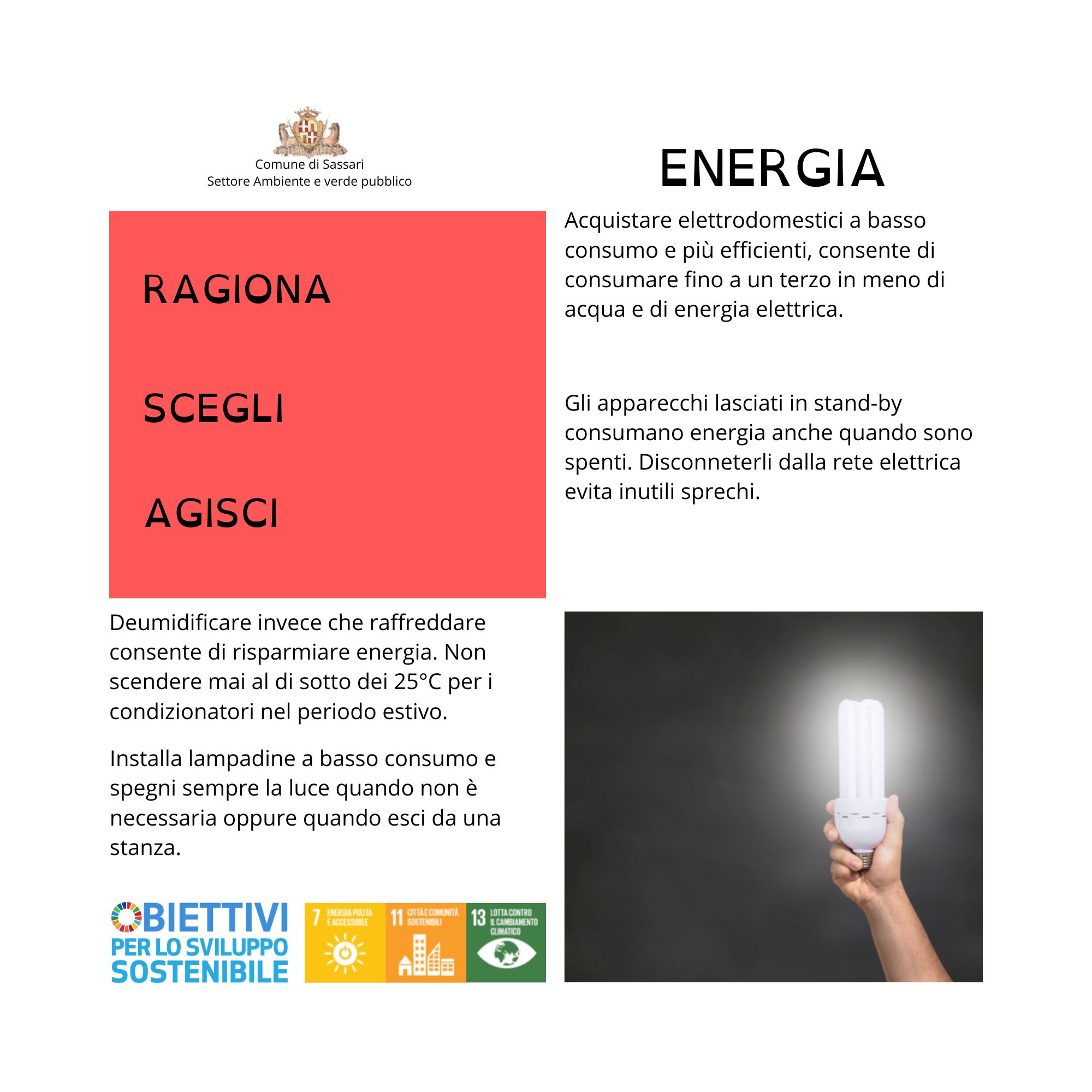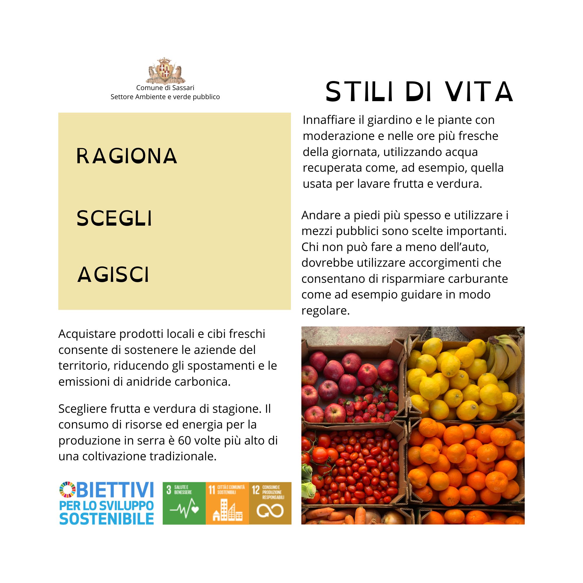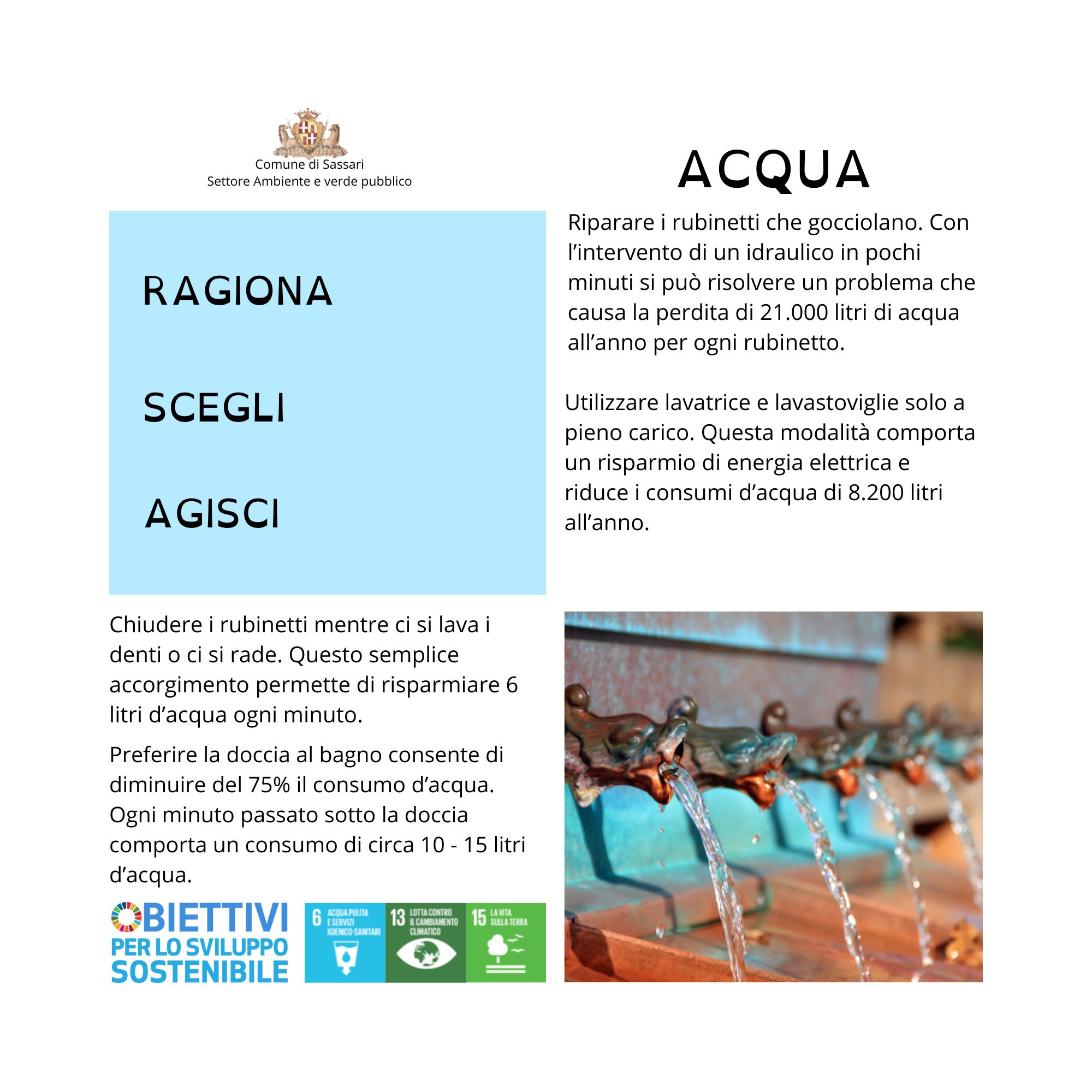 Ragiona. Scegli. Agisci. Sono questi i tre concetti su cui si basa la campagna di sensibilizzazione sui comportamenti virtuosi e di sobrietà nell’uso delle risorse ideata e promossa dal Settore Ambiente e Verde pubblico del Comune di Sassari.