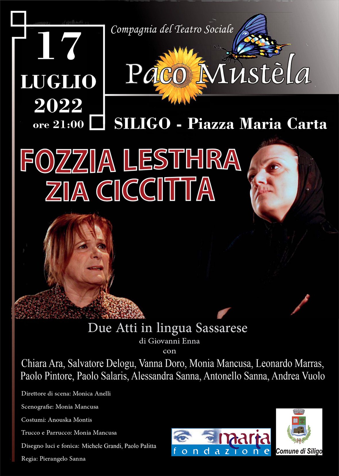 Si inizia domenica 17 luglio alle 21 in piazza Maria Carta con la commedia in lingua sassarese “Fozzia lesthra zia Ciccitta”, di Giovanni Enna, rappresentata dalla Compagnia del Teatro sociale “Paco Mustela”, con la regia di Pierangelo Sanna.