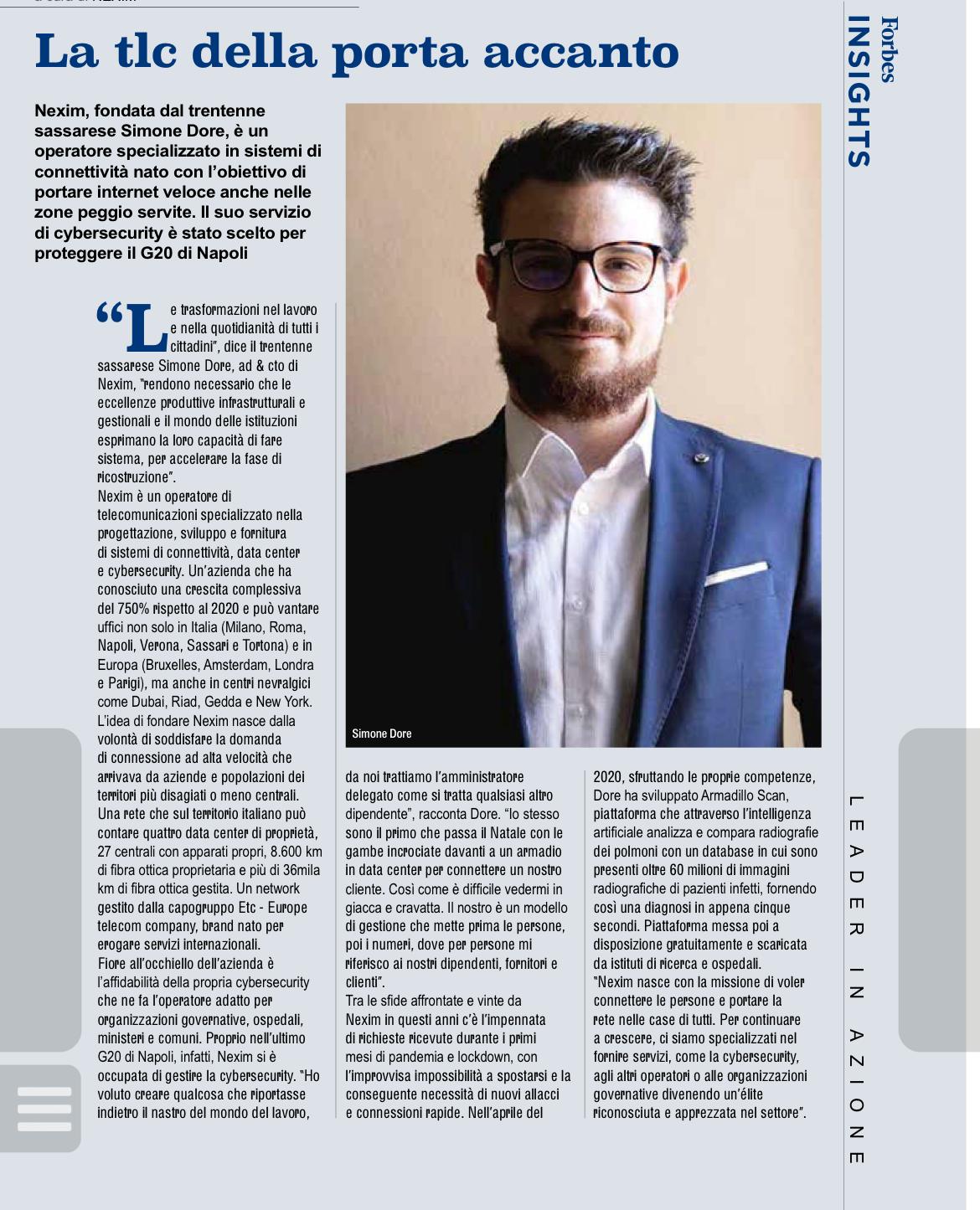 Al punto da essere considerato tra i top manager italiani menzionati dalla rivista Forbes che, nel numero di dicembre (la più importante tra le dodici mensilità del prestigioso magazine), gli dedica un’intera pagina rivelando aneddoti e curiosità sulla Nexim, l’azienda di telecomunicazioni da lui fondata, che nel solo 2021 è cresciuta del 750 per cento rispetto all’anno precedente.