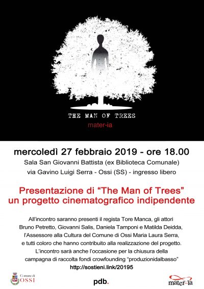 All’appuntamento sarà presente il regista Salvatore Manca, gli attori Giovanni Salis, Bruno Petretto, Daniela Tamponi, Matilda Deidda e l’Assessore alla Cultura del Comune di Ossi Maria Laura Serra. “The man of trees” è patrocinato dai Comuni di Sassari, Ploaghe, Tempio, Luras, Ossi, Scano di Montiferro, Neoneli, Giave e dalla Provincia di Sassari e gode del sostegno della Fondazione Banco di Sardegna. Al progetto hanno aderito le associazioni Wwf, Molineddu, Moviment’Arti, LIPS Cult Lega Italia Poetry Slam, Amerindia Cinema.
